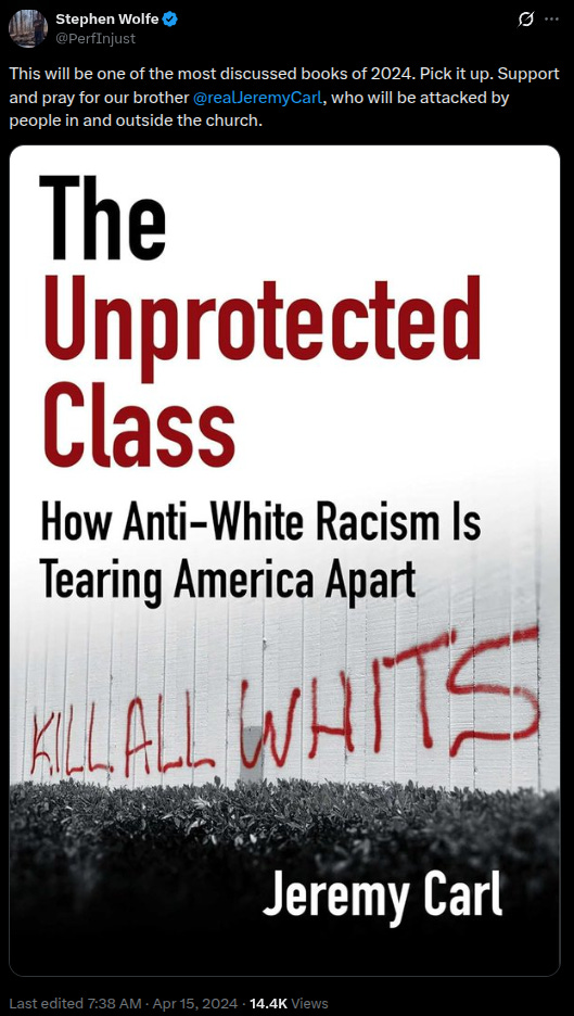 Canon Press’ Doug Wilson and Friends, What Should Be Done About the Whits (referring to the misspelled “Kill All Whits” graffiti on the cover of Carl’s book).