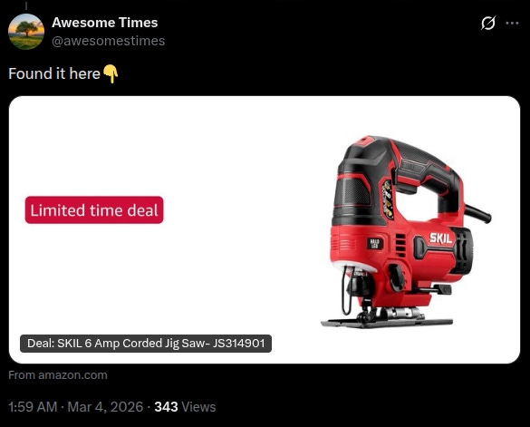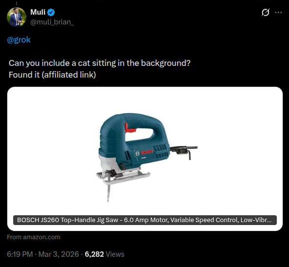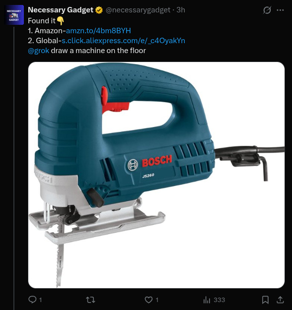 In response, an apparently AI-driven account with 20,000 followers, dedicated to finding the tools in videos and posting links to purchase them (with an affiliate code, of course), posted this: